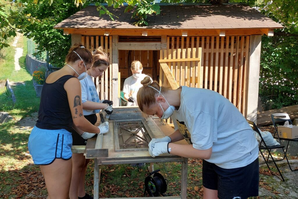 When I first saw the entrance doors of the Giser house, an old miners’ house that we were planning to renovate over the next three weeks, they were in very poor condition. At that time, I couldn’t even imagine how many hours we would spend sanding, patching, and painting in the following days. I also couldn’t imagine how much fun it would be to work with other volunteers from all over Europe and how much I would learn not only about restoring old doors but also about teamwork and life itself.